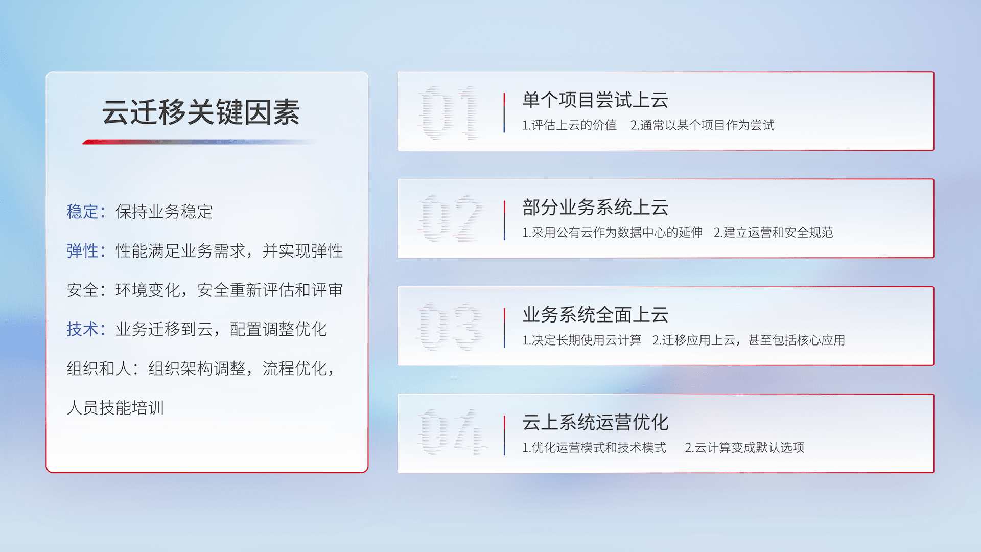 结合实际业务,,,从规划设计、、、、云平台选型、、、云原生改造、、数据迁移、、、、集成交付,,,迁移全过程为客户识别最佳上云路径,,,做好风险识别管理,,,,设计网络架构、、身份权限、、安全审计合规、、、、操作审计、、日志审计、、、、监控告警策略、、多站点容灾设计等,,对云上基础设施进行整体规划,,,提升IT治理水平,,,,以满足弹性、、高可用、、、高性能的需求。。。。