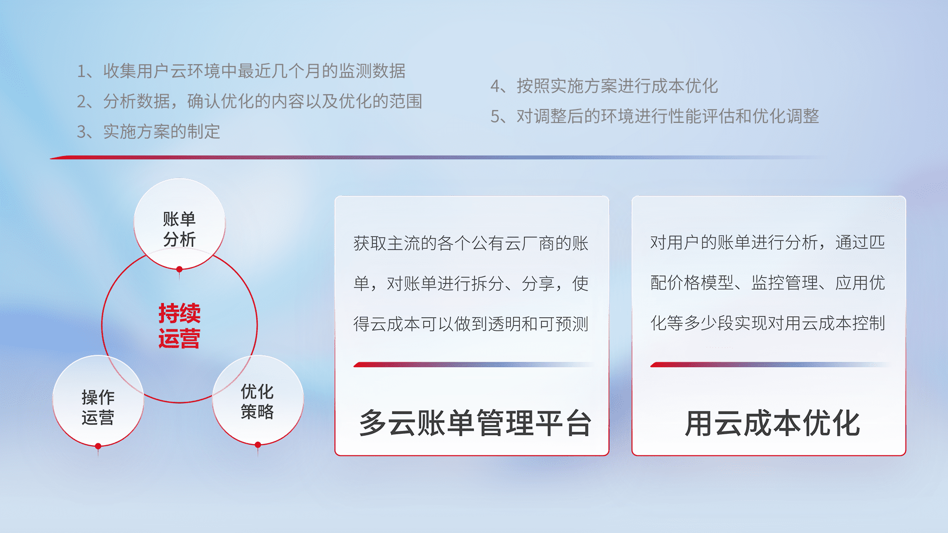 通过多云纳管,,,以统一的资源数据模型把客户的云资源进行抽象和封装,,,进而实现对多云资源的统一操作,,保障云资源管理的可靠性、、、、稳定性与可用性。。。。量身定制化运维内容,,,配置、、开发运维、、补丁管理、、、、备份、、、、监控、、、、认证和访问管理、、、审计和日常巡检等,,保障在用云过程中的可靠度,,,稳定度以及高可用率。。。
